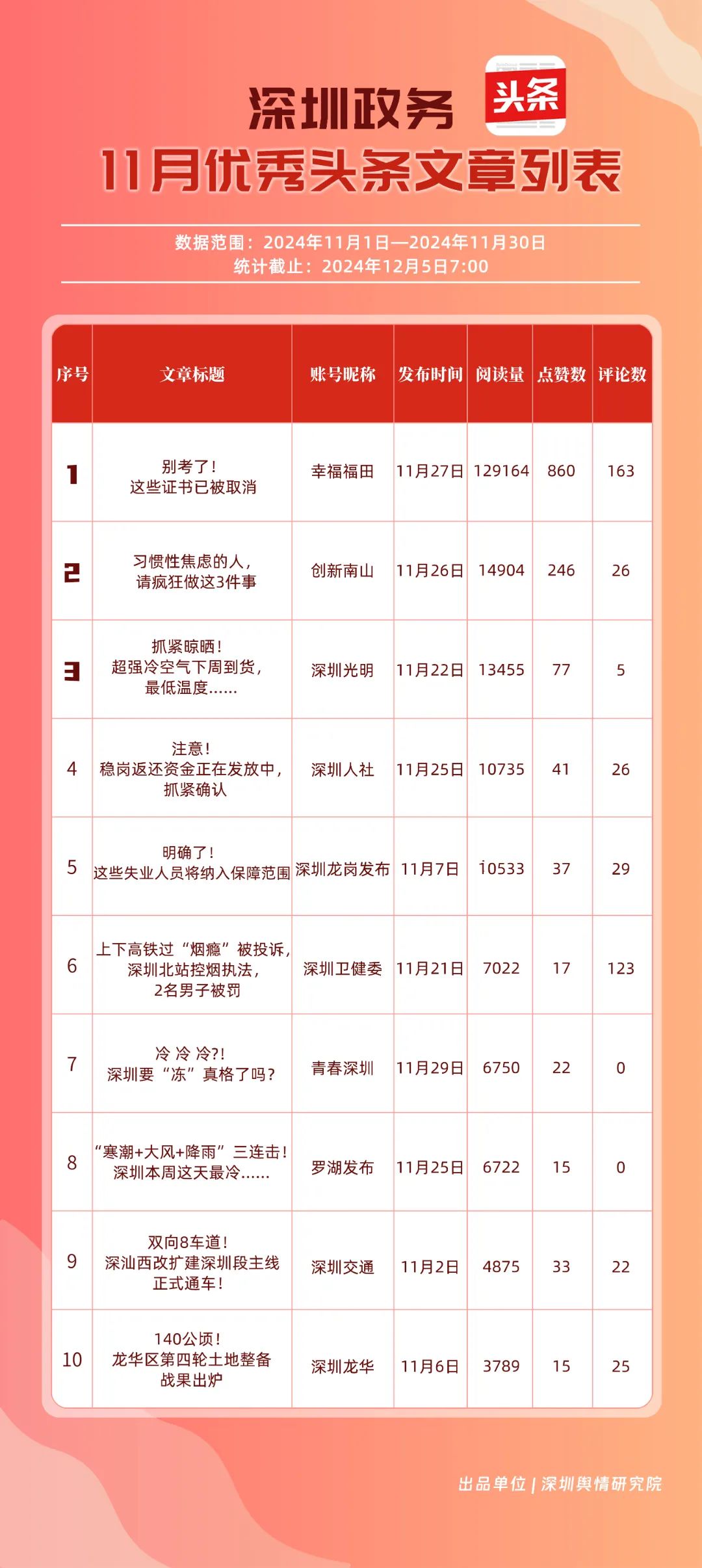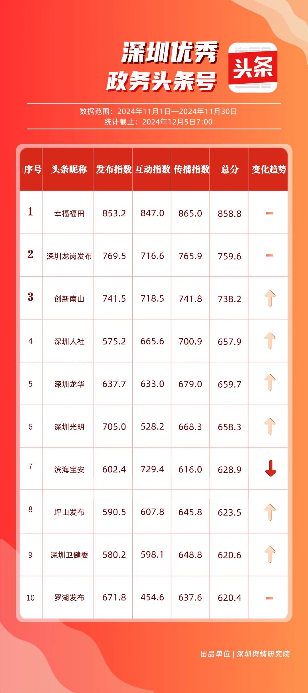 11月,“幸福福田”“深圳龍崗發(fā)布”“創(chuàng)新南山”“深圳人社”“深圳龍華”“深圳光明”“濱海寶安”“坪山發(fā)布”“深圳衛(wèi)健委”“羅湖發(fā)布”共10個(gè)政務(wù)頭條號(hào)入選“優(yōu)秀政務(wù)頭條號(hào)”榜單。“幸福福田”發(fā)布大量民生相關(guān)信息,穩(wěn)居第一。“深圳龍崗發(fā)布”同樣表現(xiàn)不凡,排名始終位于前列,展現(xiàn)了其在信息傳播與政務(wù)服務(wù)方面的卓越能力。此外,賬號(hào)“創(chuàng)新南山”“深圳人社”“深圳龍華”“深圳光明”在榜單中的排名有所提升,為政務(wù)新媒體樹立了典范。