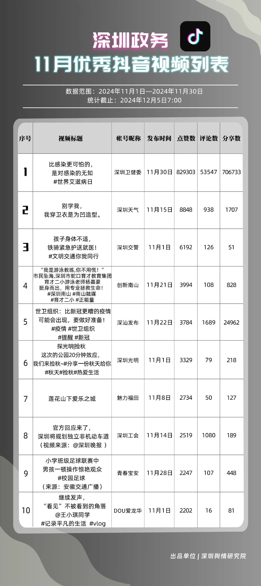 11月,“深圳衛(wèi)健委”“掌上龍崗”“深圳天氣”“深汕發(fā)布”“深圳工會(huì)”“深圳交警”“創(chuàng)新南山”“DOU愛(ài)龍華”“深圳光明”“中國(guó)前海”共10個(gè)政務(wù)抖音號(hào)獲得“深圳優(yōu)秀政務(wù)抖音號(hào)”稱號(hào)。“深圳衛(wèi)健委”憑借高質(zhì)量劇情內(nèi)容,巧妙融入健康知識(shí),視頻累計(jì)收獲近百萬(wàn)點(diǎn)贊。同時(shí),“掌上龍崗”和“深圳天氣”也在視頻內(nèi)容創(chuàng)新上不斷探索,通過(guò)優(yōu)化宣傳策略和信息傳播方式,使得網(wǎng)民能夠在輕松愉快的氛圍中了解龍崗區(qū)的最新動(dòng)態(tài)和深圳的天氣信息,展現(xiàn)了政務(wù)抖音號(hào)的獨(dú)特魅力與社會(huì)影響力。