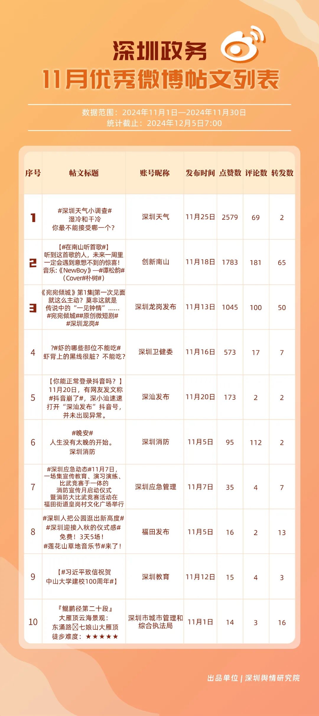 11月,“深圳天氣”“深圳衛(wèi)健委”“深圳龍崗發(fā)布”“深圳消防”“創(chuàng)新南山”“深圳應(yīng)急管理”“深圳公安”“深圳市城市管理和綜合執(zhí)法局”“福田發(fā)布”“深圳交警”等20個(gè)賬號(hào)入選“優(yōu)秀政務(wù)微博號(hào)”。“深圳天氣”“深圳衛(wèi)健委”賬號(hào)在信息傳播上不斷精進(jìn),為市民帶來(lái)及時(shí)、優(yōu)質(zhì)且高效的資訊,內(nèi)容緊貼民生,贏得了市民的廣泛贊譽(yù),排名穩(wěn)定在前2名。同時(shí),“深圳龍崗發(fā)布”“深圳消防”和“創(chuàng)新南山”等賬號(hào)也能夠精準(zhǔn)滿足市民的信息需求,并在此基礎(chǔ)上提升市民閱讀體驗(yàn),推動(dòng)了其在榜單上的穩(wěn)步提升,彰顯了政務(wù)微博的創(chuàng)新活力與社會(huì)價(jià)值。