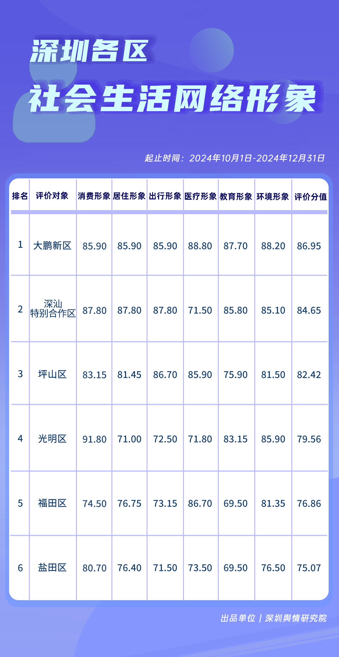 10-12月,《深圳各區(qū)社會(huì)生活網(wǎng)絡(luò)形象榜》中,大鵬新區(qū)、深汕特別合作區(qū)、坪山區(qū)綜合評(píng)價(jià)分值在80分以上,表現(xiàn)優(yōu)異。光明區(qū)、福田區(qū)、鹽田區(qū)各有所長(zhǎng),分別占據(jù)了榜單第四至第六的位置,成為深圳各區(qū)致力于改善社會(huì)民生、促進(jìn)區(qū)域協(xié)調(diào)發(fā)展的生動(dòng)范例。