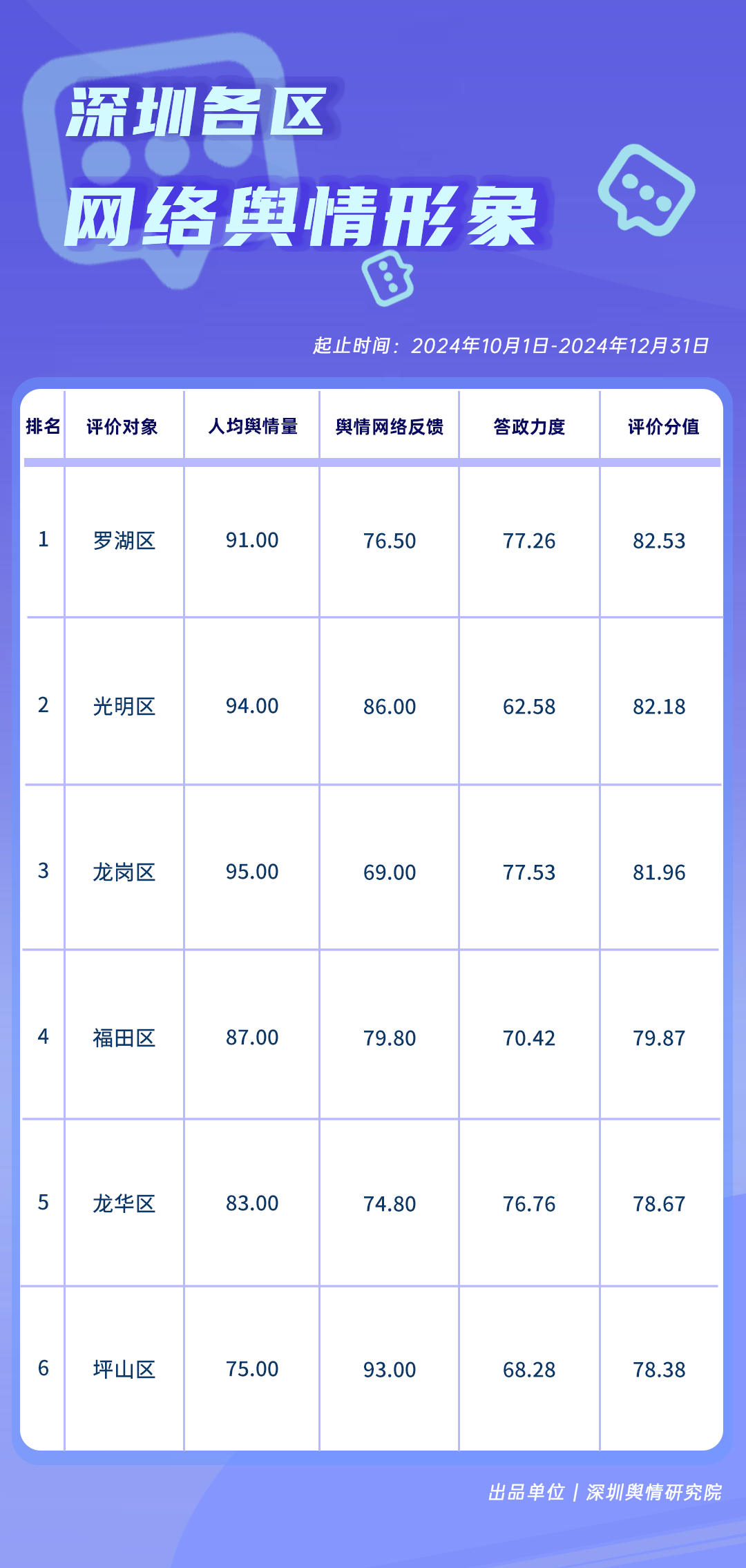 網(wǎng)絡(luò)輿情方面,羅湖區(qū)、光明區(qū)、龍崗區(qū)得分在80分以上,登上《深圳各區(qū)網(wǎng)絡(luò)輿情形象榜》前三名,福田區(qū)、龍華區(qū)、坪山區(qū)以超過(guò)75分的綜合評(píng)價(jià)分值上榜,體現(xiàn)出各區(qū)在維護(hù)良好網(wǎng)絡(luò)輿情生態(tài)、快速響應(yīng)網(wǎng)民關(guān)切等方面的積極態(tài)度。
