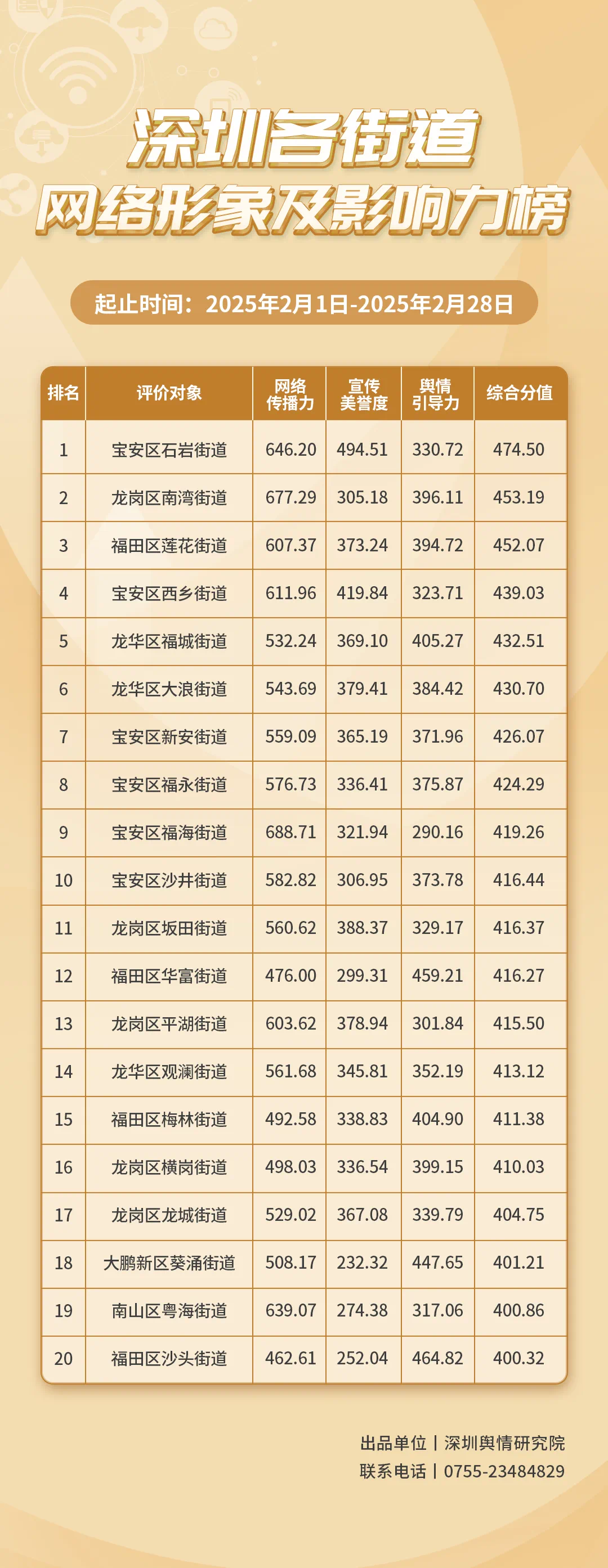 2025年2月,共有20個(gè)街道登上《深圳各街道網(wǎng)絡(luò)形象及影響力榜》,分別是:寶安區(qū)石巖街道、龍崗區(qū)南灣街道、福田區(qū)蓮花街道、寶安區(qū)西鄉(xiāng)街道、龍華區(qū)福城街道、龍華區(qū)大浪街道、寶安區(qū)新安街道、寶安區(qū)福永街道、寶安區(qū)福海街道、寶安區(qū)沙井街道、龍崗區(qū)坂田街道、福田區(qū)華富街道、龍崗區(qū)平湖街道、龍華區(qū)觀瀾街道、福田區(qū)梅林街道、龍崗區(qū)橫崗街道、龍崗區(qū)龍城街道、大鵬新區(qū)葵涌街道、南山區(qū)粵海街道、福田區(qū)沙頭街道。