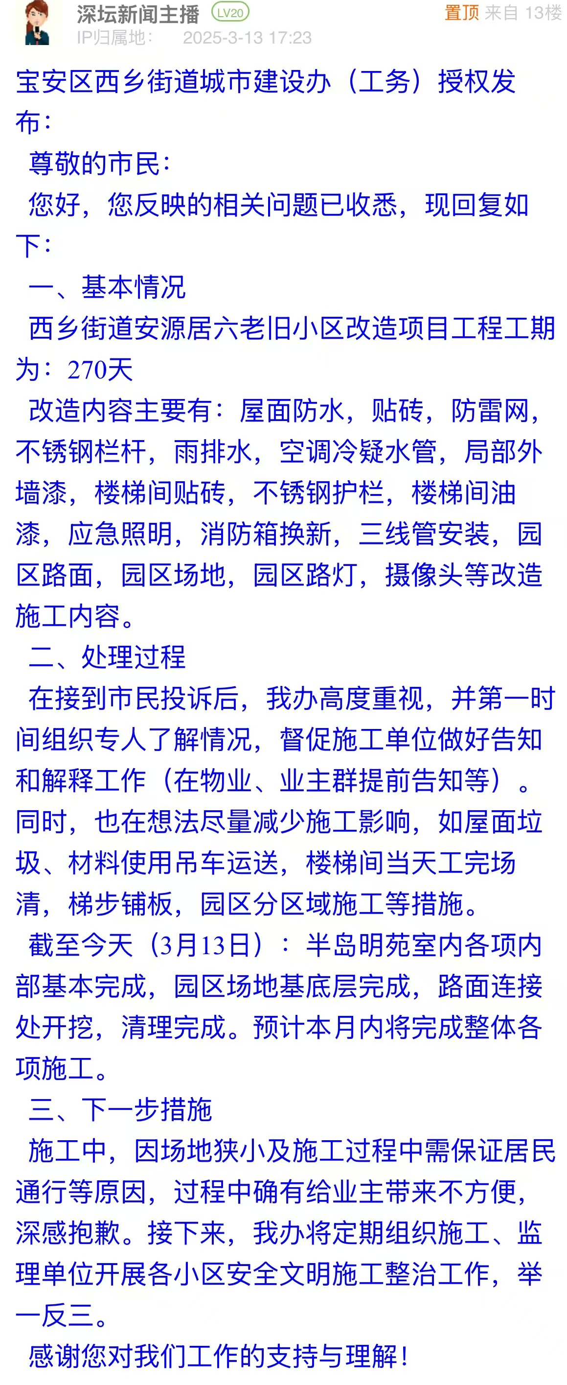案例點(diǎn)評(píng):市民投訴后,街道辦快速介入,做好信息公開及解釋工作,表示工程正在穩(wěn)步推進(jìn),并協(xié)助優(yōu)化施工流程,體現(xiàn)了主動(dòng)作為的態(tài)度,保障居民知情權(quán)與參與權(quán)。回應(yīng)中,街道辦還承諾將舉一反三,減少類似問題出現(xiàn),是對(duì)未來工作的深遠(yuǎn)規(guī)劃,真正為民生工程贏得群眾滿意而努力,值得推廣。