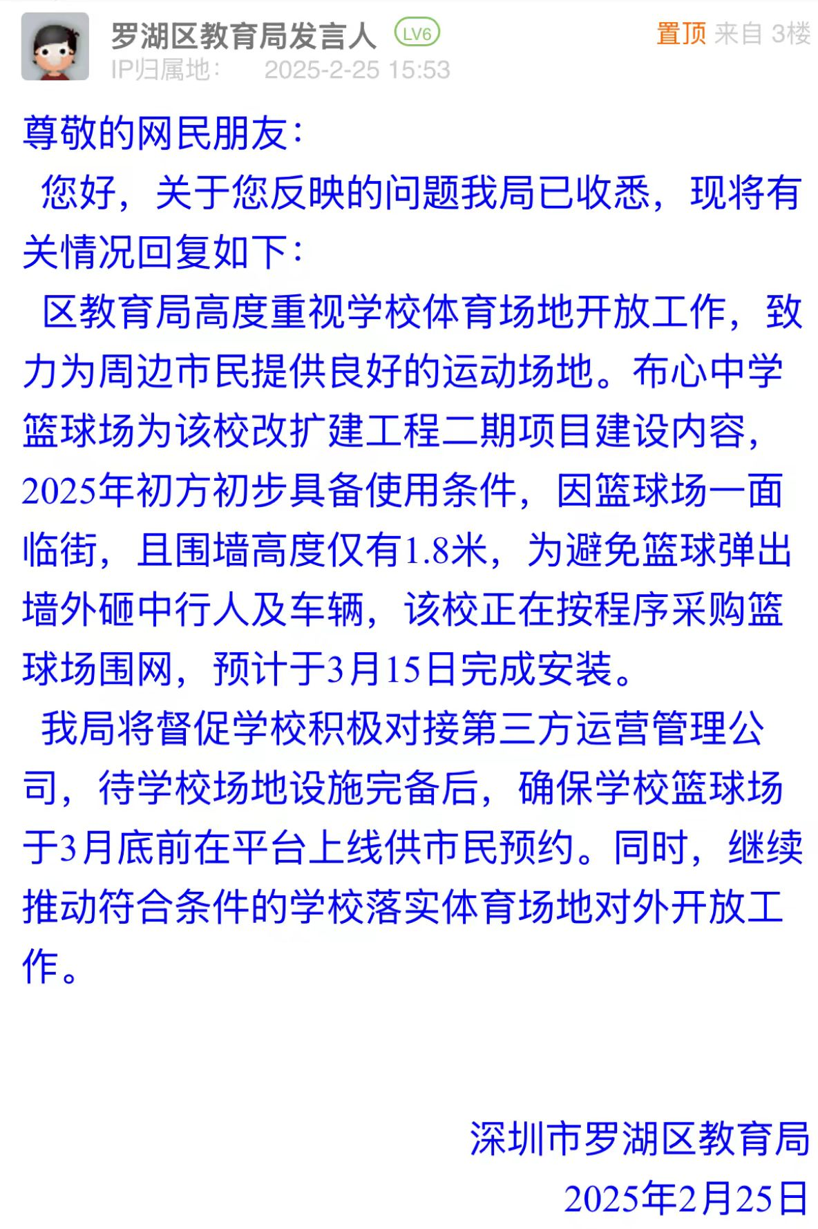案例點(diǎn)評(píng):市民關(guān)注布心中學(xué)籃球場開放時(shí)間,反映出對(duì)公共運(yùn)動(dòng)空間的迫切需求。羅湖區(qū)教育局詳細(xì)說明場地未開放原因及施工節(jié)點(diǎn),并明確后續(xù)開放計(jì)劃,有效化解群眾疑慮,有助于“全民健身”政策更好落地。