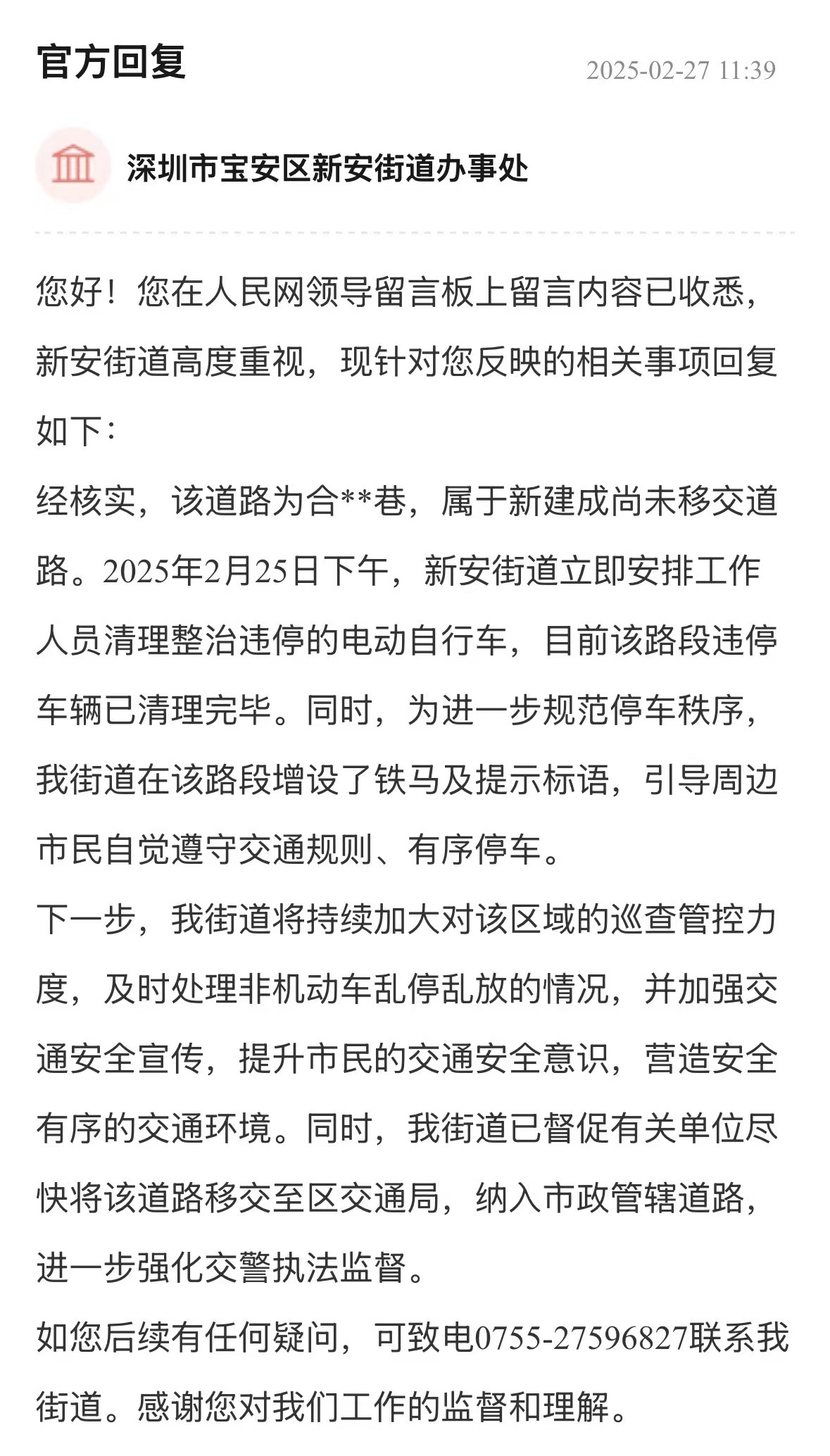 案例點(diǎn)評(píng):非機(jī)動(dòng)車亂停放影響交通和消防安全,嚴(yán)重影響市民生活。街道辦行動(dòng)迅速,第一時(shí)間清理違停車輛,增設(shè)鐵馬及提示標(biāo)語,規(guī)范停車秩序,展現(xiàn)了高效的處置能力。回應(yīng)中,街道還制定了長效治理計(jì)劃,構(gòu)建“短期整治+長效管理”模式,有助于解決區(qū)域交通問題,提升城市管理水平。