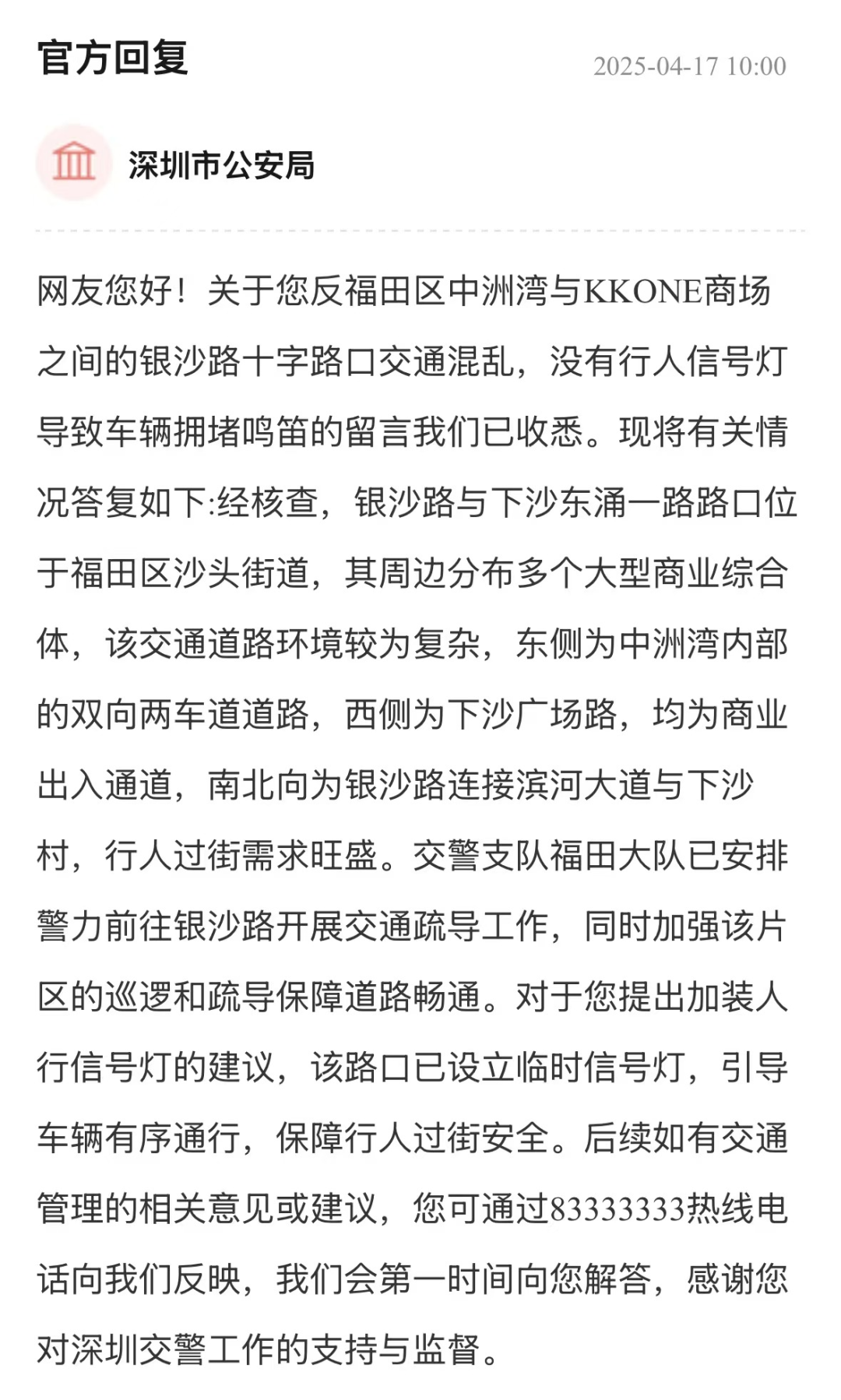 案例點(diǎn)評(píng):商圈周邊商業(yè)密集、道路結(jié)構(gòu)復(fù)雜,面對(duì)市民反映問題,市公安局交通警察局一方面安排警力現(xiàn)場(chǎng)疏導(dǎo),另一方面根據(jù)實(shí)際情況,設(shè)立臨時(shí)信號(hào)燈,引導(dǎo)行人安全過街,車輛有序通行。雖未立即加裝固定信號(hào)燈,但該局以“應(yīng)急處置、靈活調(diào)整”的務(wù)實(shí)方式解決燃眉之急,此類快速響應(yīng)與因地制宜的處置模式,為商圈復(fù)雜路口交通管理提供范本。