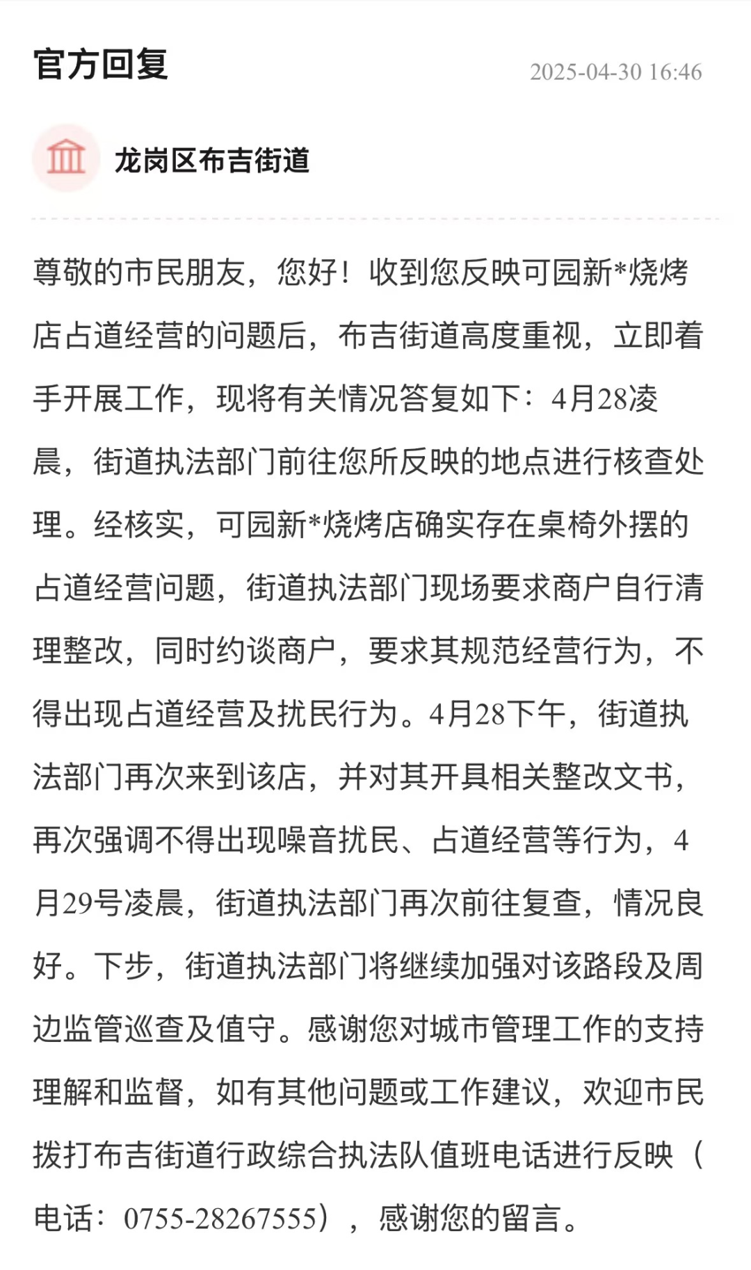 針對(duì)燒烤店占道經(jīng)營與凌晨噪音擾民問題,街道辦行動(dòng)迅速,回應(yīng)中處置流程清晰。在現(xiàn)場(chǎng)核查確認(rèn)違規(guī)事實(shí)后,街道辦開具整改文書,開展復(fù)查、加強(qiáng)周邊監(jiān)管,解決商業(yè)經(jīng)營店鋪擾民問題,以規(guī)范行動(dòng)守護(hù)居民“寧靜權(quán)”,展現(xiàn)了基層執(zhí)法的高效務(wù)實(shí),切實(shí)提升了群眾生活幸福感。