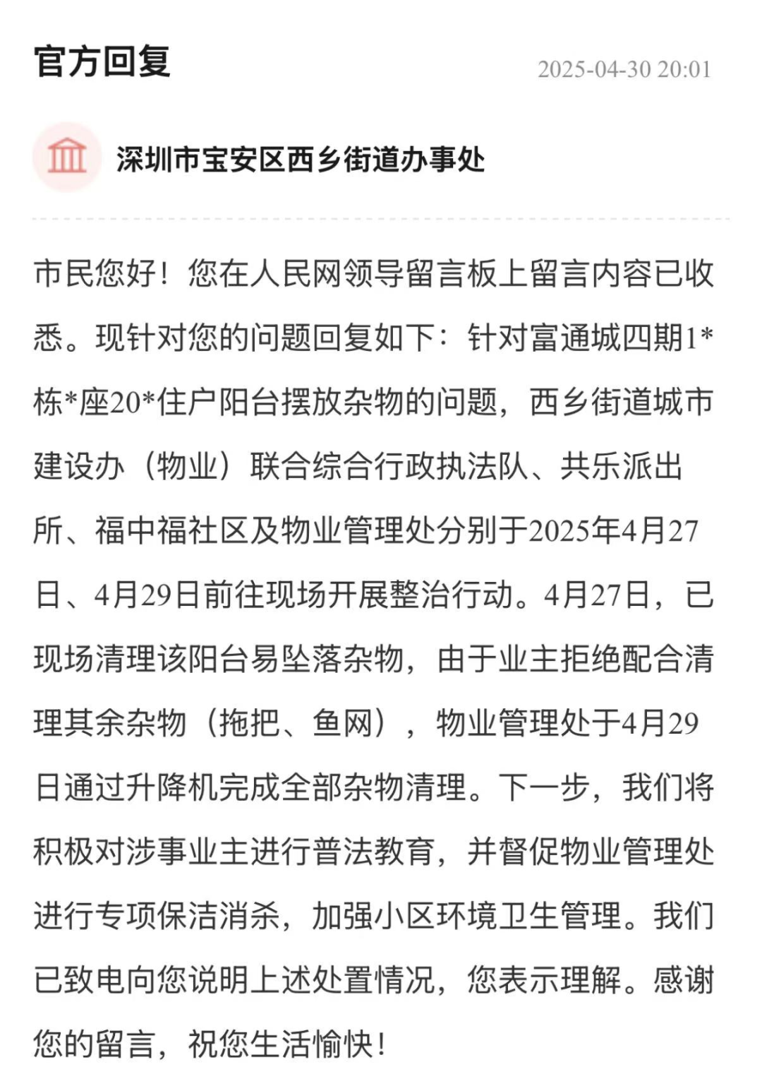 有市民反映寶安區(qū)西鄉(xiāng)街道富通城一住戶在陽臺(tái)懸掛雜物,嚴(yán)重影響居住環(huán)境