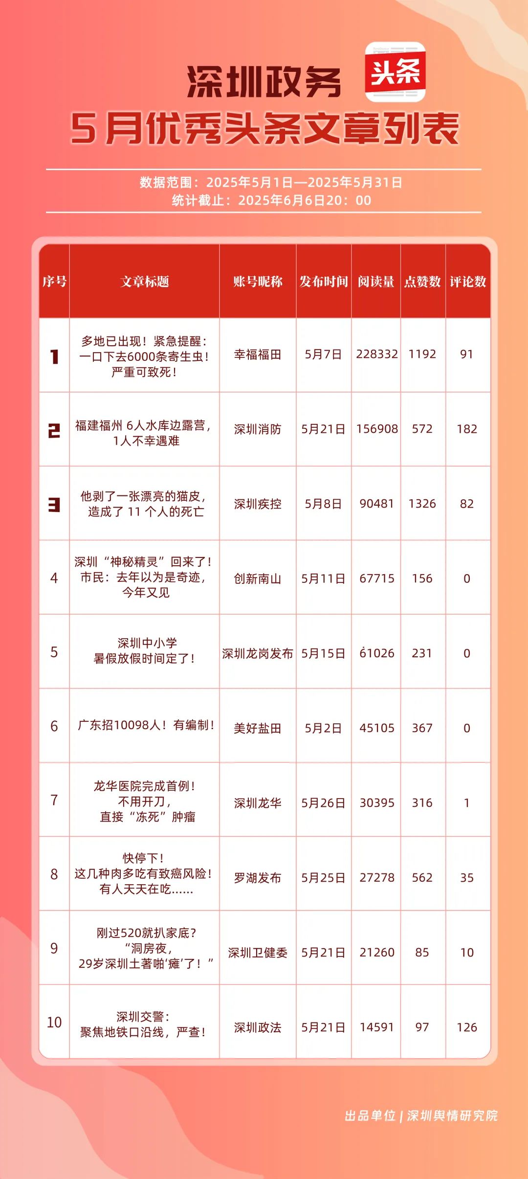 5月,“幸福福田”“深圳消防”“創(chuàng)新南山”“深圳疾控”“羅湖發(fā)布”“深圳龍崗發(fā)布”“坪山發(fā)布”“青春深圳”“深圳龍華”“深圳人社”共10個(gè)政務(wù)頭條號(hào)入選“優(yōu)秀政務(wù)頭條號(hào)”榜單。在榜單前三名中,“幸福福田”“創(chuàng)新南山”以穩(wěn)定且高質(zhì)量的內(nèi)容輸出,持續(xù)領(lǐng)跑,排名較上個(gè)月未發(fā)生變動(dòng)。位居榜單第二的“深圳消防”同樣表現(xiàn)亮眼,排名較上個(gè)月提升2個(gè)名次,充分展現(xiàn)了其在消防安全宣傳領(lǐng)域的持續(xù)深耕和創(chuàng)新突破。上榜政務(wù)頭條號(hào)各展所長,以優(yōu)質(zhì)內(nèi)容為核心,充分發(fā)揮平臺(tái)傳播優(yōu)勢,為政務(wù)信息的高效觸達(dá)與廣泛傳播樹立了標(biāo)桿。