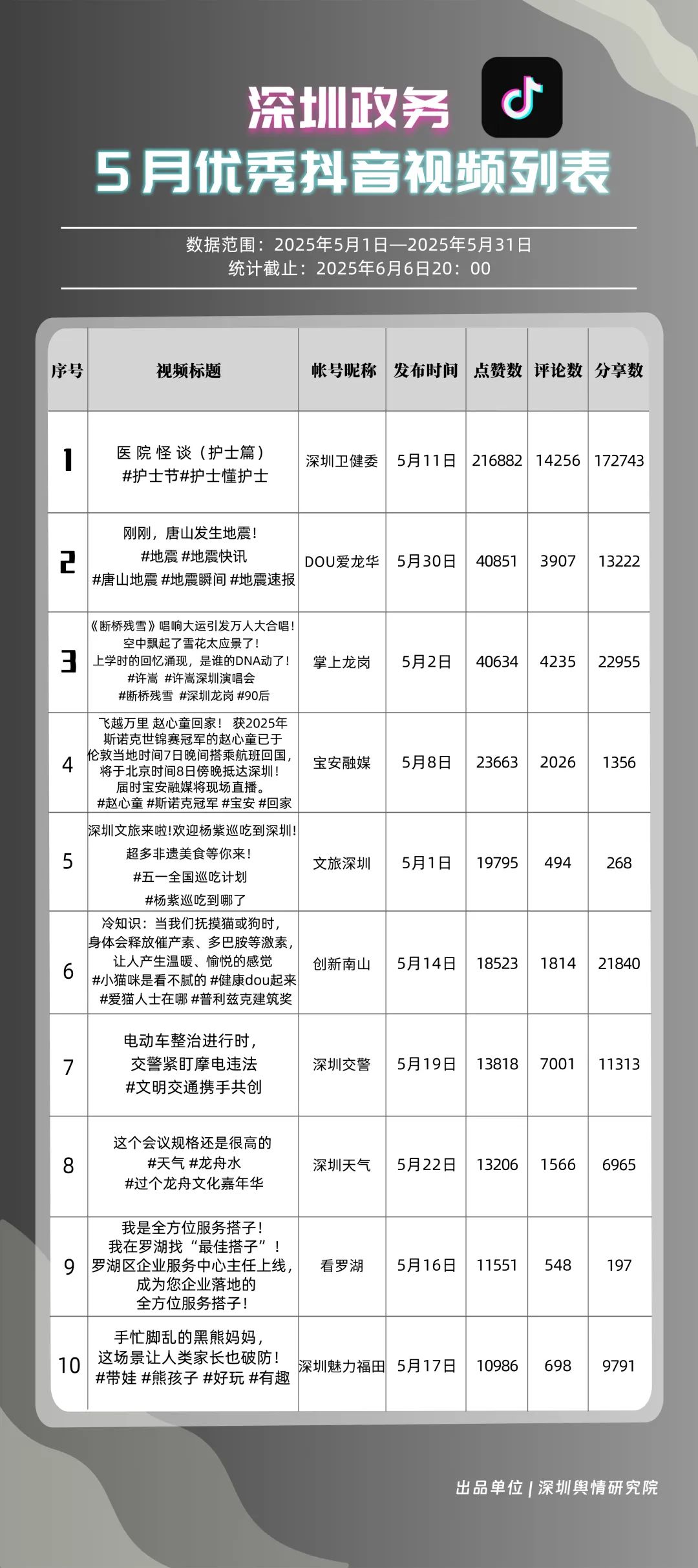 5月,“深圳衛(wèi)健委”“DOU愛龍華”“掌上龍崗”“深圳天氣”“創(chuàng)新南山”“深圳交警”“深圳魅力福田”“寶安融媒”“深汕發(fā)布”“文旅深圳”共10個(gè)政務(wù)抖音號(hào)獲得“優(yōu)秀政務(wù)抖音號(hào)”稱號(hào)。5月,“深圳衛(wèi)健委”憑借3條極具創(chuàng)意的視頻內(nèi)容持續(xù)收獲網(wǎng)民關(guān)注,穩(wěn)居榜首之位,成為政務(wù)抖音號(hào)領(lǐng)域的標(biāo)桿。“DOU愛龍華”“掌上龍崗”較上個(gè)月排名大幅度上升,以96.77分和95.81分位居榜單第2、3名,彰顯出積極探索創(chuàng)新傳播路徑、開拓政務(wù)短視頻發(fā)展新可能的決心。以上優(yōu)秀政務(wù)抖音號(hào)通過多樣化的短視頻形式傳遞政務(wù)資訊,為深圳政務(wù)新媒體在短視頻領(lǐng)域的蓬勃發(fā)展注入強(qiáng)勁動(dòng)能,成為政務(wù)信息傳播的新標(biāo)桿。
