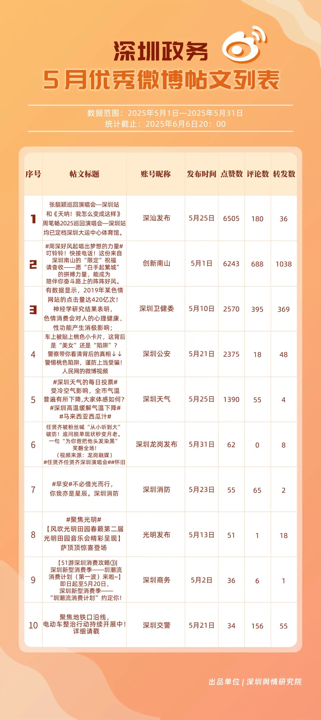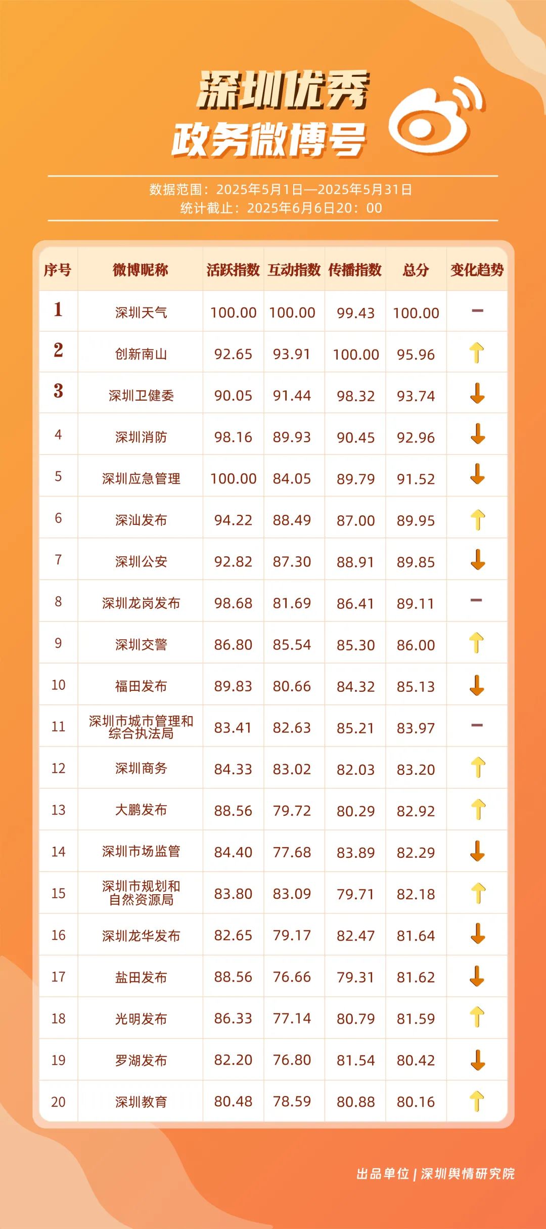 5月,“深圳天氣”“創(chuàng)新南山”“深圳衛(wèi)健委”“深圳消防”“深圳應(yīng)急管理”“深汕發(fā)布”“深圳公安”“深圳龍崗發(fā)布”“深圳交警”“福田發(fā)布”等20個(gè)賬號(hào)入選“優(yōu)秀政務(wù)微博號(hào)”。其中,“深圳天氣”憑借活躍指數(shù)和互動(dòng)指數(shù)雙項(xiàng)滿分的亮眼成績,穩(wěn)居榜單首位。“創(chuàng)新南山”以95.96分緊隨其后,在互動(dòng)、傳播指數(shù)得分大幅提升,排名實(shí)現(xiàn)顯著躍升?!吧钲谛l(wèi)健委”“深圳消防”“深圳應(yīng)急管理”也表現(xiàn)卓越,總分均超過90分,它們憑借權(quán)威信息發(fā)布、專業(yè)知識(shí)科普,展現(xiàn)了各單位在民生服務(wù)、公共安全領(lǐng)域的重要作用。以上優(yōu)秀政務(wù)微博號(hào)深度契合平臺(tái)的傳播特征,善于借助熱門話題擴(kuò)大影響力,以鮮明的賬號(hào)特色展現(xiàn)區(qū)域風(fēng)采。