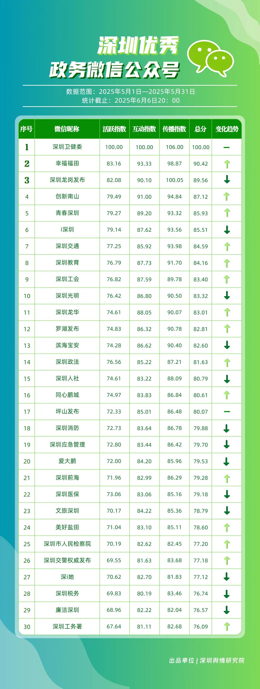 5月,30個(gè)政務(wù)微信公眾號(hào)入選“深圳優(yōu)秀政務(wù)微信公眾號(hào)”榜單,其中包括“深圳衛(wèi)健委”“幸福福田”“深圳龍崗發(fā)布”“創(chuàng)新南山”“青春深圳”“i深圳”“深圳交通”“深圳教育”“深圳工會(huì)”“深圳光明”等。其中,“深圳衛(wèi)健委”在活躍、互動(dòng)、傳播3項(xiàng)指標(biāo)上獲得滿分,其亮眼數(shù)據(jù)彰顯了內(nèi)容創(chuàng)作的高質(zhì)量,位居榜單首位?!靶腋8L铩蓖瑯颖憩F(xiàn)出色,排名較上個(gè)月有所上升,以總分90.42的優(yōu)異成績位居榜單第2名;“深圳龍崗發(fā)布”“創(chuàng)新南山”“青春深圳”緊隨其后,以新穎的互動(dòng)形式吸引用戶參與,表現(xiàn)值得肯定。上榜賬號(hào)充分發(fā)揮微信公眾平臺(tái)的傳播優(yōu)勢,以豐富多元的內(nèi)容形態(tài)、生動(dòng)鮮活的表達(dá)風(fēng)格,持續(xù)為市民提供優(yōu)質(zhì)的信息服務(wù)。