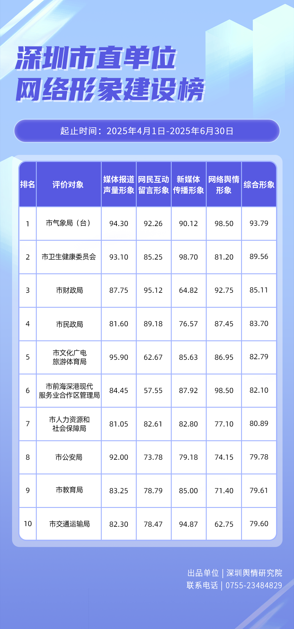 4-6月,市氣象局、市衛(wèi)生健康委員會、市財政局、市民政局、市文化廣電旅游體育局、市前海深港現(xiàn)代服務(wù)業(yè)合作區(qū)管理局、市人力資源和社會保障局、市公安局、市教育局、市交通運(yùn)輸局在網(wǎng)絡(luò)形象建設(shè)工作方面表現(xiàn)相對突出,登上《深圳市直單位網(wǎng)絡(luò)形象建設(shè)榜》。其中,市氣象局、市衛(wèi)生健康委員會的網(wǎng)絡(luò)形象建設(shè)工作持續(xù)走在前列,其他上榜單位各展所長,在網(wǎng)絡(luò)宣傳、互動回應(yīng)等方面積極作為,共同塑造深圳市直單位良好網(wǎng)絡(luò)形象。