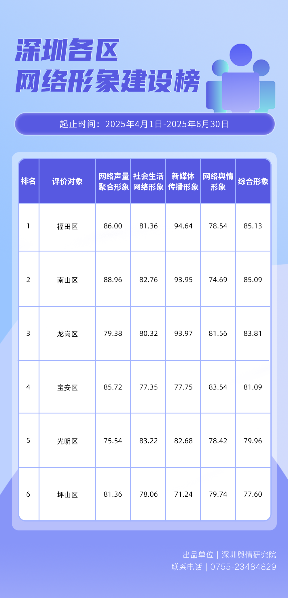 4-6月,《深圳各區(qū)社會生活網(wǎng)絡(luò)形象榜》中,光明區(qū)憑借在居住、醫(yī)療、出行等多方面的良好網(wǎng)絡(luò)呈現(xiàn),獲得較高綜合評價分值,南山區(qū)、福田區(qū)、龍崗區(qū)也表現(xiàn)優(yōu)異,四區(qū)綜合評價分值均超80分。大鵬新區(qū)、深汕特別合作區(qū)也在榜單中占據(jù)靠前位置,成為各區(qū)借助網(wǎng)絡(luò)力量增進(jìn)民生福祉、推動協(xié)調(diào)發(fā)展的生動展現(xiàn)。
