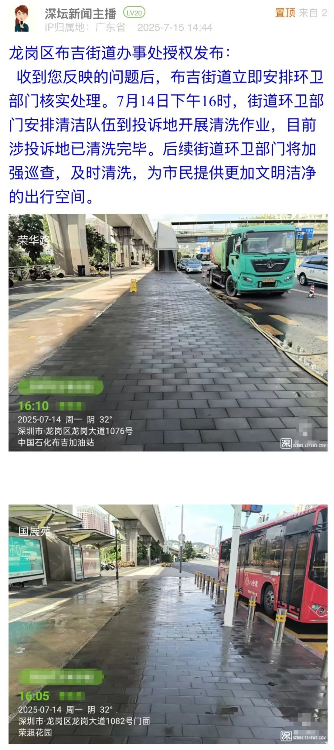 案例點評:對于市民反映的路面油污問題,布吉街道辦立即安排環(huán)衛(wèi)部門進行清洗,并于第二日在問政帖文下進行回復,以現(xiàn)場圖片展示路面清理效果,表示將加強后續(xù)巡查。此次處置展現(xiàn)了基層部門高效務實的問題處理能力,為城市道路環(huán)境管理提供了快速響應與長效維護相結(jié)合的實踐范例,切實回應了市民對潔凈環(huán)境的期待。