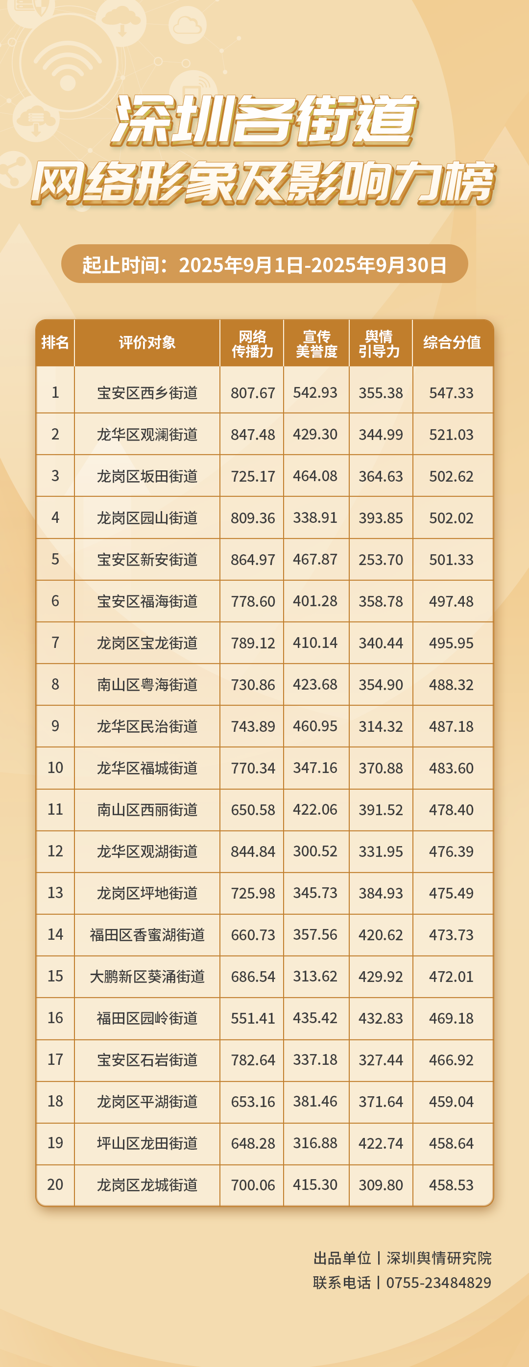 為深入了解深圳市各街道的網(wǎng)絡形象構建狀況和社會影響,推動街道治理“提質(zhì)增效”,增強城市高質(zhì)量發(fā)展動能,深圳輿情研究院編制推出《深圳各街道網(wǎng)絡形象及影響力榜》。榜單具有獨立客觀的評價體系,通過數(shù)據(jù)采集和分析,評估各街道的網(wǎng)絡傳播力、宣傳美譽度及輿情引導力,并對全市11個區(qū)共78個街道的網(wǎng)絡形象及影響力進行綜合排名。