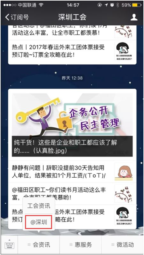 11月23日,深圳市總工會(huì)官方微信“深圳工會(huì)”正式入駐“@深圳”平臺(tái)。