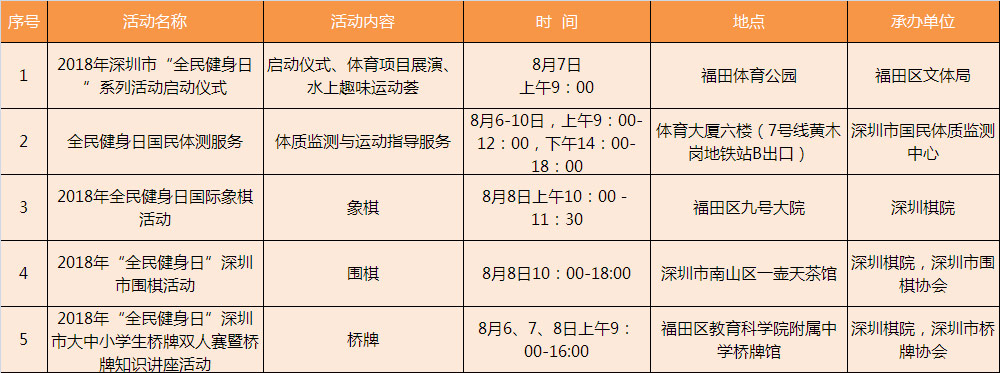 為迎接今年8月8日第十個全國“全民健身日”,增強(qiáng)全民健身意識,培養(yǎng)良好的體育鍛煉習(xí)慣,在全社會形成崇尚健身、參與健身、支持和推動全民健身事業(yè)發(fā)展的良好環(huán)境和氛圍,為構(gòu)建和諧社會發(fā)揮積極的作用,深圳市體育中心積極開展全民健身日免費(fèi)開放系列活動,于8月8日免費(fèi)開放(深圳體育館、深圳游泳跳水館、深圳網(wǎng)球中心、深圳體育場等四家體育場館,田徑、籃球、廣場體育、游泳、保齡球、壁球和網(wǎng)球7個項(xiàng)目。