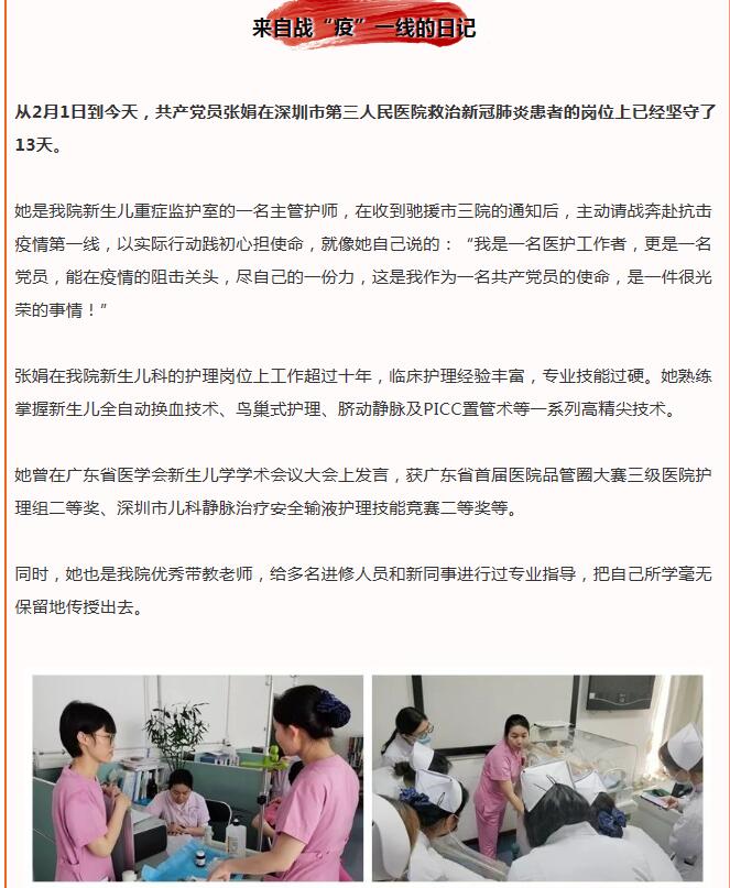 賴碧娟是深圳市婦幼保健院急診黨支部書記、急診科護士長。作為一名老黨員,抱著“疫情快些得到控制,最大程度減少損失”的信念,新冠肺炎疫情期間,她帶頭沖在一線,整個春節(jié)期間基本都在醫(yī)院加班?!拔覀兗痹\科全體黨員和醫(yī)護人員都嚴(yán)陣以待。只要有需要,所有人都沖在一線?!?/p>